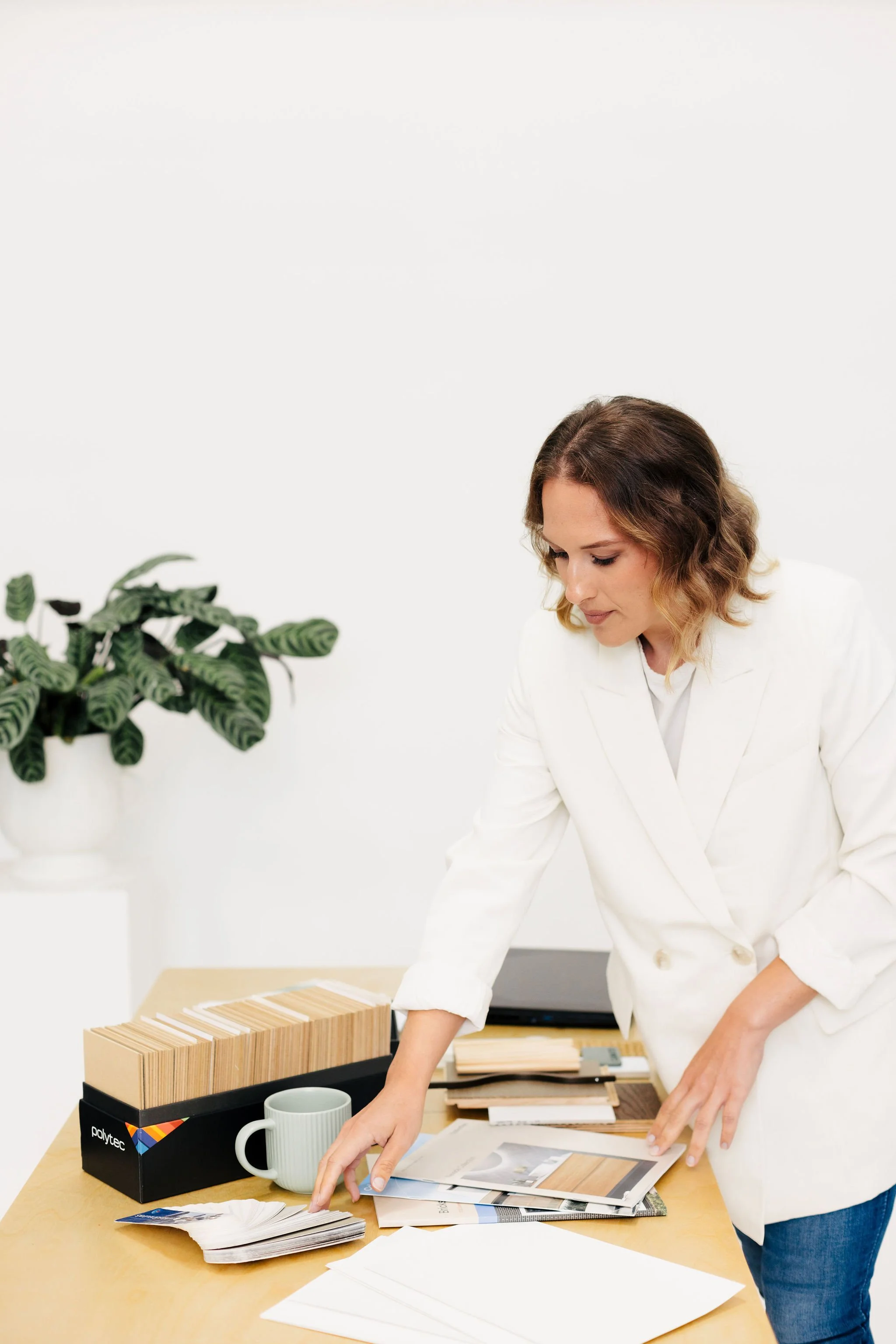 A woman with shoulder-length wavy hair smiling, wearing a white blazer and dark jeans, standing behind a desk with various papers, magazines, a mug, a phone, and sample materials, in a bright white room with a leafy plant.